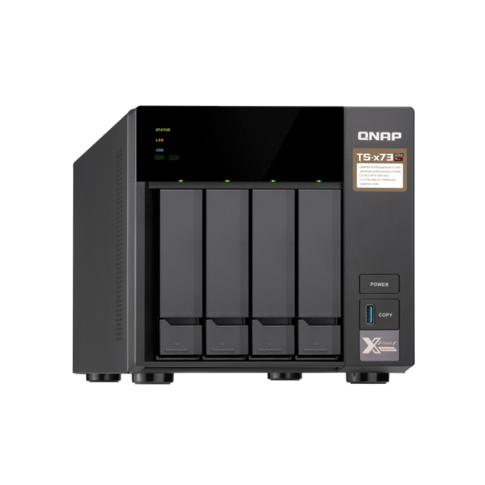 Настольная система хранения TS-473 предназначена для решения бизнес-задач, связанных с одновременным хранением и обработкой данных. NAS оснащен производительным процессором AMD R-Series RX-421ND 2,1 ГГц, 8 Гбайт RAM DDR4, расширяемой до 64 Гбайт и 2 слотами для M.2 SATA SSD. В архитектуре предусмотрены 2 слота PCIe, которые допускают установку карт QM2, 10 Гбит/с сетевых или графических карт начального уровня. В базовом варианте устройство оснащено четырьмя 1 Гбит/с RJ45 сетевыми портами, что позволяет без проблем встроить устройство в имеющуюся сетевую инфраструктуру. Такое количество портов без проблем позволяет разделить ресурсы NAS на несколько рабочих групп и разграничить права доступа по физически отдельным сетевым интерфейсам.