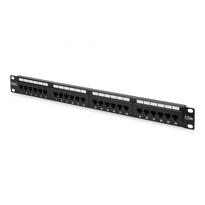 Патч-панель от компании Digitus категории 5е с технологией экранировки UTP (экранировка отсутствует). 24 порта данной патч-панели имеют формат RJ-45. Кабели устанавливаются при помощи планок типа LSA, имеющих цветовую кодировку. Так же имеется возможность фиксирования кабельных стяжек. Совместима со шкафом 19" (483 мм). В качестве материала используется SECC, он же 1.5 мм гальванизированная холоднокатанная сталь.