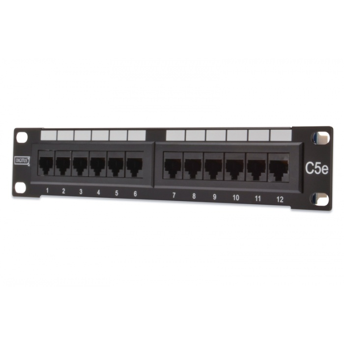 Патч-панель от компании Digitus категории 5е с экранировкой UTP. 12 гнёзд данной патч-панели имеют формат RJ-45. Кабели устанавливаются при помощи планок LSA с цветовой кодировкой. Так же имеются возможности винтового зажима оболочек и креплений для кабельных стяжек, проводов заземления. Совместима со шкафом 10" (254 мм). В качестве материала используется SECC, он же 1.5 мм гальванизированная холоднокатанная сталь.