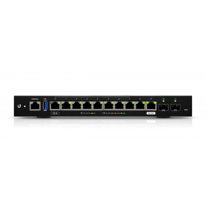 EdgeRouter 12 оборудован 12-ю гигабитными портами. В их числе 10 стандартных Ethernet для подсоединения витой пары и 2 SFP для подсоединения к оптоволокну. Порт №0 позволяет подавать питание PoE. Сквозной выход к порту №9 по схеме Passthrough. Среди интерфейсов также присутствует USB и консольный порт.