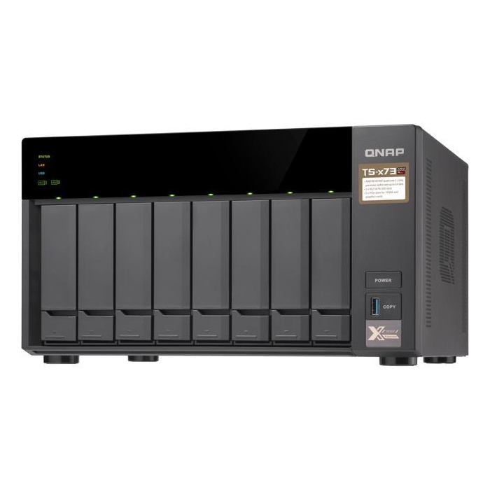 Настольная система хранения TS-873 предназначена для решения бизнес-задач, связанных с одновременным хранением и обработкой данных. NAS оснащен производительным процессором AMD R-Series RX-421ND 2,1 ГГц, 4 Гбайт RAM DDR4, расширяемой до 64 Гбайт и 2 слотами для M.2 SATA SSD. В архитектуре предусмотрены 2 слота PCIe, которые допускают установку карт QM2, 10 Гбит/с сетевых или графических карт начального уровня. В базовом варианте устройство оснащено четырьмя 1 Гбит/с RJ45 сетевыми портами, что позволяет без проблем встроить устройство в имеющуюся сетевую инфраструктуру. Такое количество портов без проблем позволяет разделить ресурсы NAS на несколько рабочих групп и разграничить права доступа по физически отдельным сетевым интерфейсам.