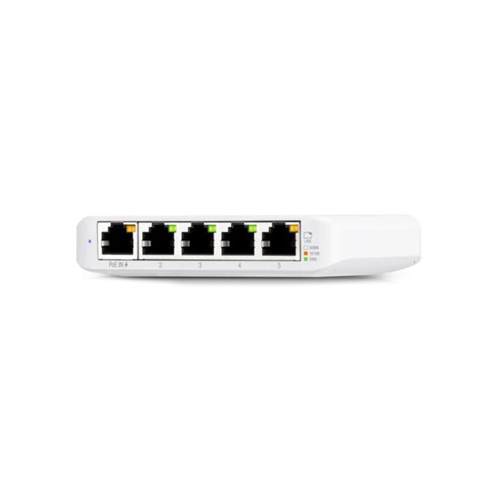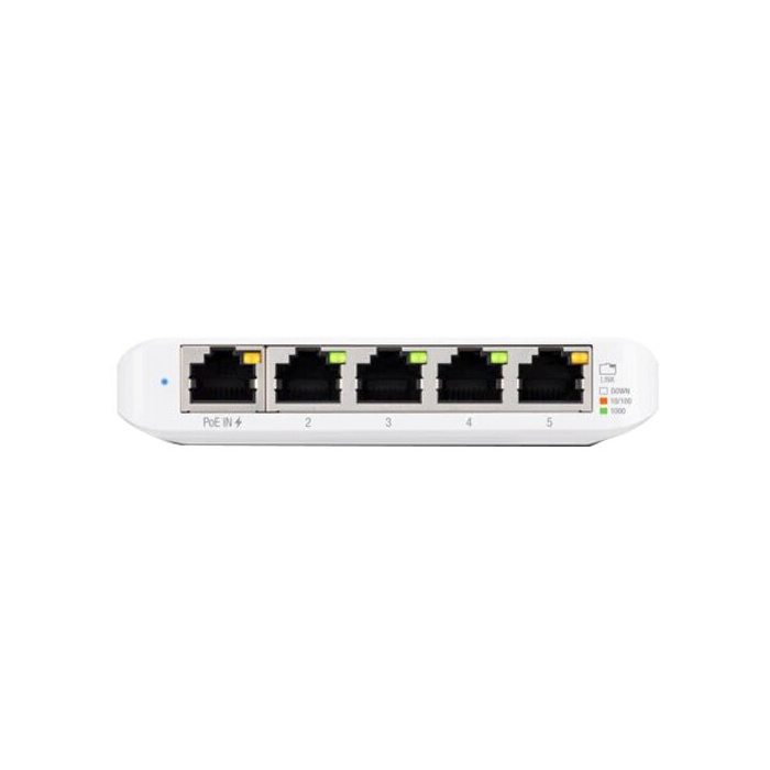 С помощью коммутатора USW-Flex-Mini Вы сможете создать небольшую UniFi сеть или же расширить уже существующую. Модель является интеллектуальным управляемым гигабитным свитчем с 5 портами RJ45 Ethernet. Устройством будет обеспечена гигабитная связь между оборудованием в сети. Подачу питания на UniFi Switch Flex Mini можно реализовать при помощи входящего в комплектацию поставки адаптера USB Type-C или же за счёт Ethernet-порта 802.3af PoE под номером 1. (+р)