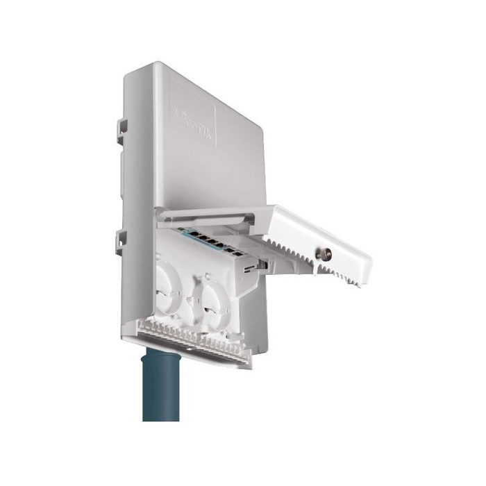 Это простой в развертывании, недорогой способ для любого интернет-провайдера доставить Интернет в отдельные квартиры. Для подключения к оптике предусмотрены два 10G SFP+ порта. Наружный корпус позволяет устанавливать устройство в любых местах - на влажных чердаках, в лифтовых шахтах и на различных опорах с использованием хомутов.