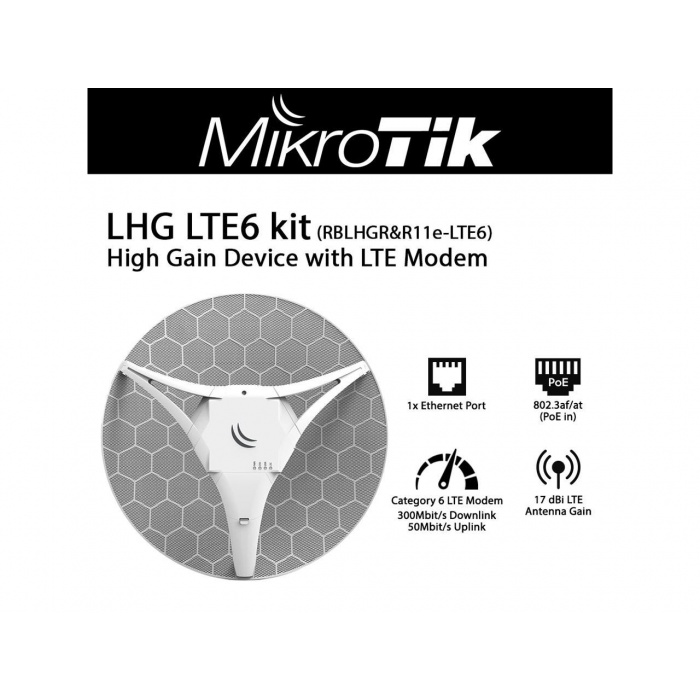 Все та же уникальная сетчатая конструкция LHG и карта R11e-LTE6 в комплекте LHG LTE6 kit предлагают идеальный вариант для очень удаленных мест, где из доступных подключений только сотовая связь. Установив устройство на мачте, столбе или любой высокой конструкции вы сможете подключиться к Интернету даже там, где у телефонов нет покрытия. Рефлектор из металлической сетки не тяжелый и устойчив к сильному ветру. Это позволило в LHG создать антенну с высоким коэффициентом усиления, большого размера не снизив при этом устойчивость конструкции. Усиление антенны LTE в LHG LTE6 составляет 17 dBi. К тому же антенный элемент встроен в беспроводной блок - без потерь на кабелях. В основе устройства стоит достаточно мощный QCA9531 650 MHz процессор и 64 Мб оперативной памяти, что гарантирует стабильную работу точки доступа. LHG LTE6 также поддерживает 802.3af/at и может питаться от любого PoE устройства. В комплекте есть PoE injector.
