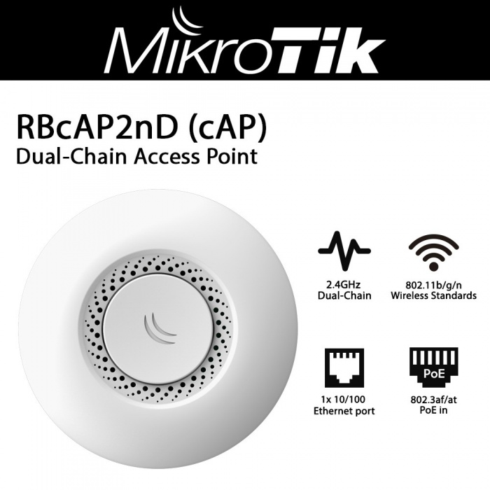 Точка доступа Wi-Fi Mikrotik cAP (RBcAP2nD) - это первая "потолочная" точка доступа, от компании Mikrotik. Которая по замыслу производителя, должна гармонично вписаться в любой интерьер и может стать неотъемлемой частью даже самого изысканного дизайна. Она малозаметна и легко вписывается с среду офиса, отеля, ресторана или другого помещения.