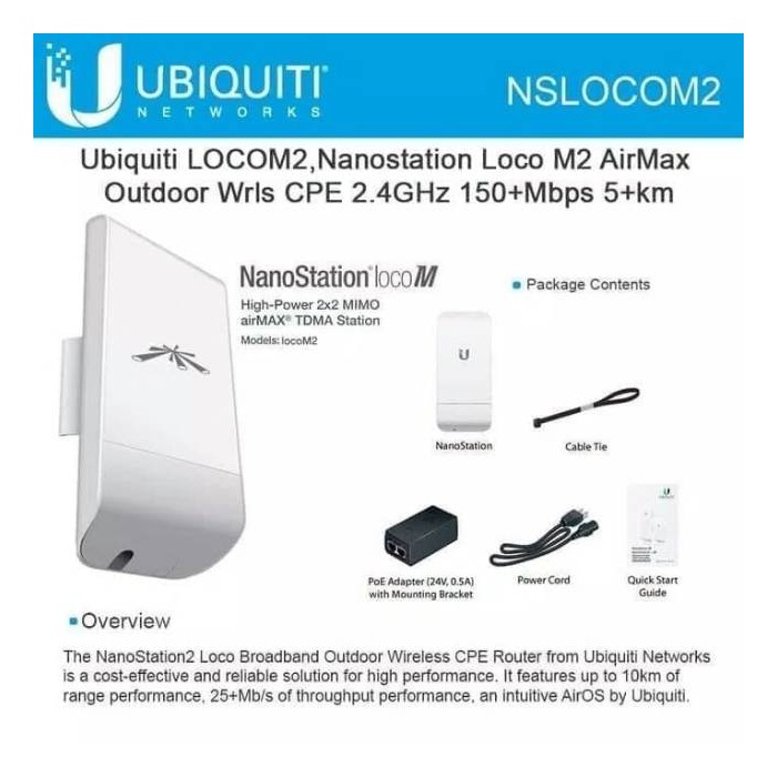 Точка доступа Wi-Fi Ubiquiti LOCO M2 (LOCO M2) имеет встроенную двохполяризационную антенну с коэффициентом усиления 8 дБи, процессор Atheros MIPS 24KC с тактовой частотой 400 МГц, оперативную память SDRAM 32 MB и 8Mб Flash памяти. Она оснащена операционной системой AirOS, благодаря чему она может работать в режиме точки доступа и в режиме клиента, а также оснащена функцией WDS, которая способствует улучшению беспроводного соединения и качества работы оборудования. Кроме того, эта точка доступа поддерживает все доступные Ubiquiti виды шифрования, а благодаря функции SuperChannel может использовать широкий спектр частот. Беспроводная точка доступа может работать при температуре воздуха от -30 до 80 ° C, влажности воздуха от 5 до 95 % с образованием конденсата. При небольших габаритах и маленьком весе она не боится даже сильных порывов ветра.