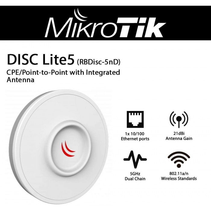 Точка доступа Mikrotik RB-Disc-5nD снабжена встроенной антенной 21 dBi, радио-модулем 802.11n MIMO 2x2, процессором с частотой 600MHz, оперативной памятью на 64 MB, портом 10/100Mbps Ethernet и лицензией RouterOS L3. В процессоре уже встроен беспроводной модуль для поддержки 2-ух каналов MIMO и стандартов 802.11 a/n.