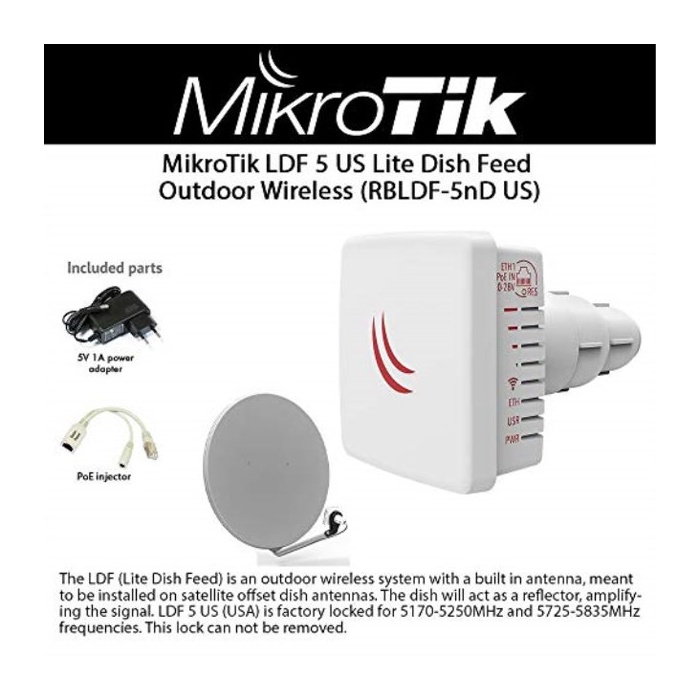 Конструкция офсетного крепления универсальна и его диаметр равен 4 см. Это означает, что LDF-2 легко разместиться в нём. Управление беспроводной системой Mikrotik RB-LDF-2nD происходит при помощи RouterOS. При покупке клиент получает помимо самой системы еще блок питания, соответствующий параметрам PoE инжектор и универсальные кронштейны диаметром 4 см. Комплектация не имеет спутниковой антенны.