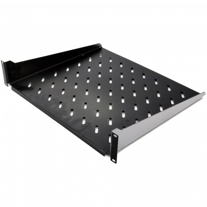 Полки 19″ спроектированы с вертикальными ребрами жесткости, что позволяет выдерживать равномерно распределенную нагрузку до 12 килограмм без деформации. Модельный рад представлен шестью моделями глубиной от 200 мм до 450 мм, с шагом 50 мм. Начиная c модели глубиной 400 мм, крепежная высота полки увеличивается с 1U (44 мм) до 2U (88 мм).