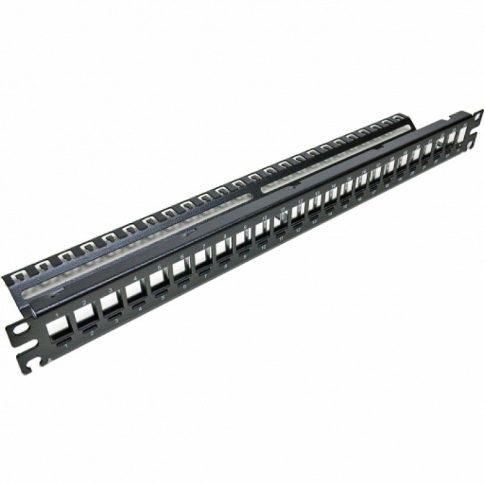 Модульная патч-панель 19″ 24 порта (наборная панель) – одна из составных частей структурированной кабельной системы (СКС), предназначена для расключения витой пари со стороны точки коммутации, например в серверном шкафу или коммутационной стойке.