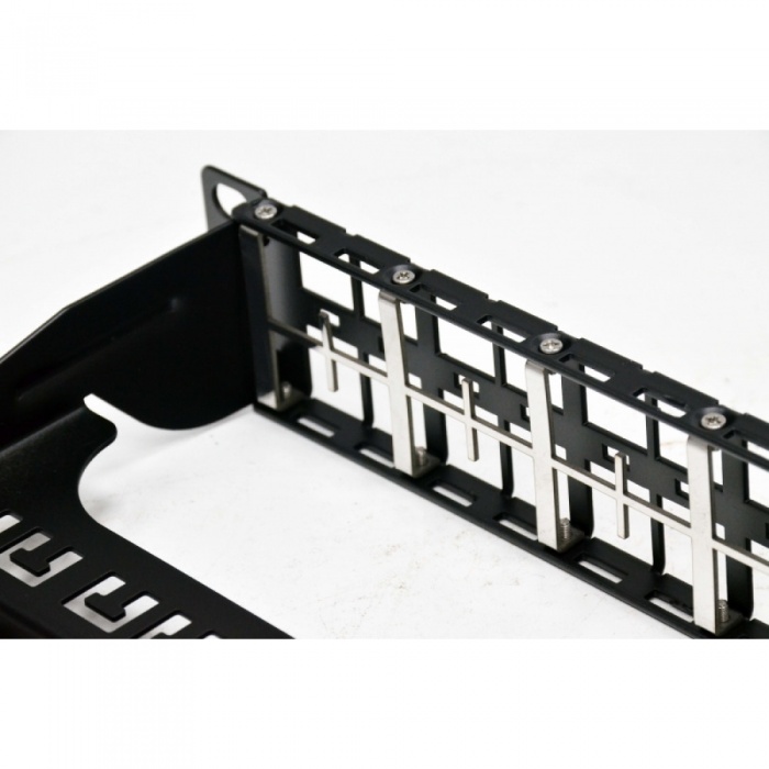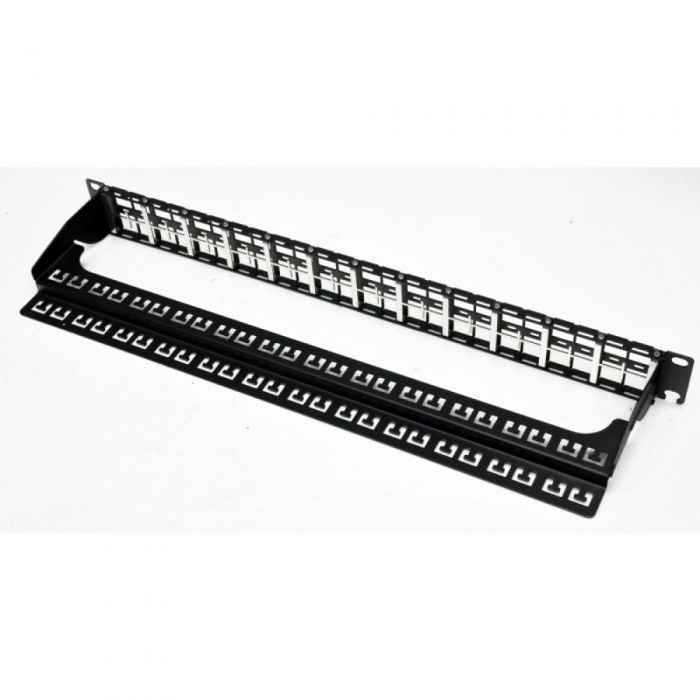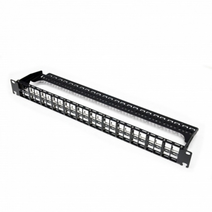 Модульная патч-панель 1U 48 портов KeyStone – одна из составных частей структурированной кабельной системы (СКС), предназначена для расключения витой пари со стороны точки коммутации, например в серверном шкафу или коммутационной стойке. Патч-панель изготовлена из стали и покрашена порошковой краской. Конструкция предусматривает кабельный органайзер для фиксации 48 кабелей витой пары пластиковыми стяжками. Для неиспользуемых портов под модули предусмотрены черные пластиковые заглушки с креплением формата KeyStone (заказываются отдельно).