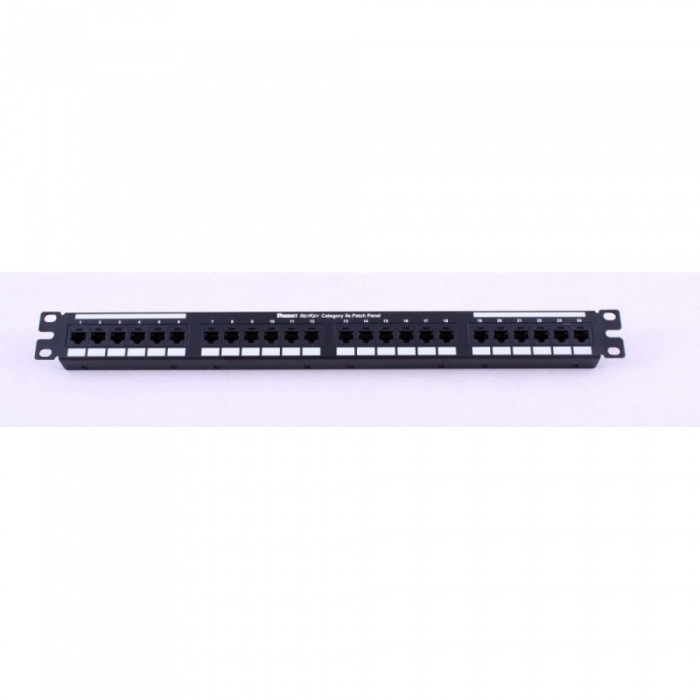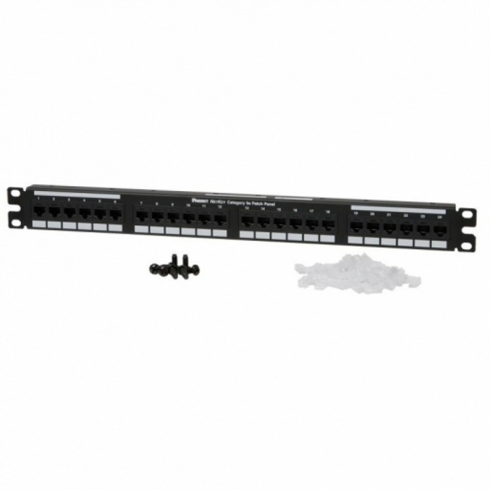 Патч-панель кат. 5е UTP устанавливается в серверный шкаф или стойку и используется для подключения витой пары со стороны точки коммутации с активным сетевым оборудованием. Установочная высота 1U в направляющие 19 дюймов на четыре точки крепления. Основание панели изготовлено из стали с пластиковыми вставками под коннекторы RJ-45. Подключение заземления не предусмотрено, патч-панель неэкранированная.