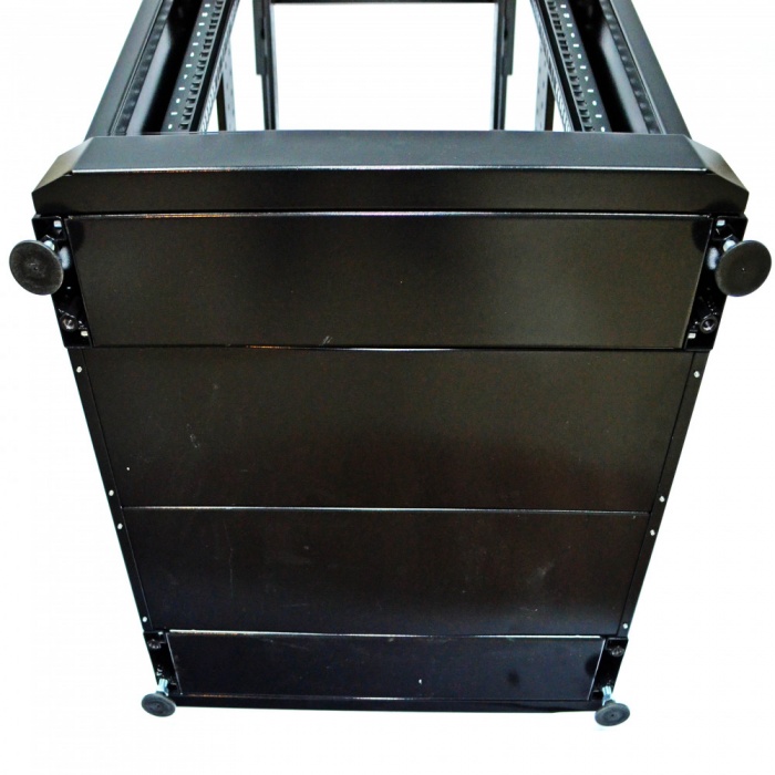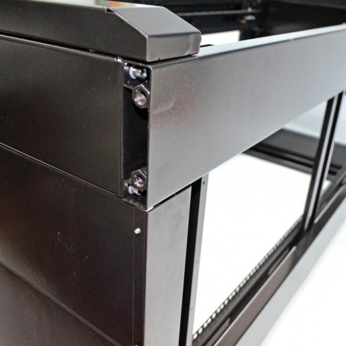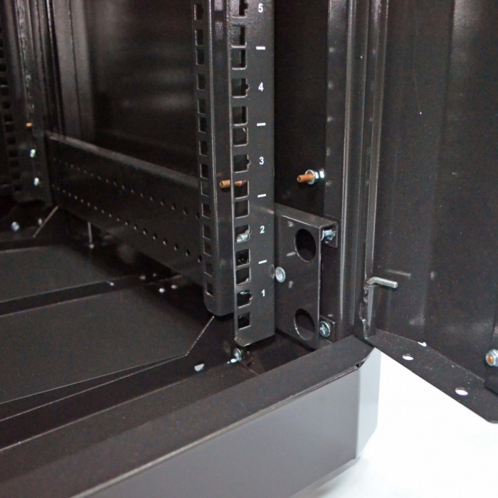 Конструкция имеет 8 приваренных гаек для монтажа ножек, расположенных в углах вертикального элемента каркаса, что позволяет установить коммутационный шкаф в серверной и отрегулировать горизонтальное положение. 8 креплений необходимо для того, чтобы можно было поставить шкафы вплотную (в одном ножки остаются по краям, у второго – ближе к середине). 4 ножки входят в комплект. Для монтажа колёс необходимо самостоятельно сделать отверстия в элементе каркаса.