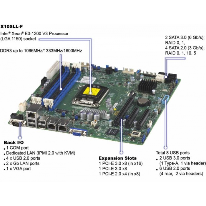 - 1 PCI-E 3.0 x8 (in x16), 1 PCI-E 3.0 x8, and 1 PCI-E 2.0 x4 (in x8) slots