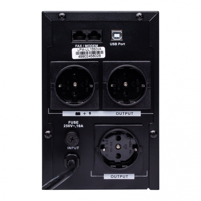 ИБП LPM-UL1550VA наделен функциями защиты от короткого замыкания, скачков напряжения, перегрузок, разряда и избыточного заряда батарей. В случаях отключения электроэнергии ИБП LPM-UL1550VA поддерживает работу электроприборов от двух аккумуляторов на протяжении 10-15 минут. Время переключения в автономный режим – 4-6 мс.