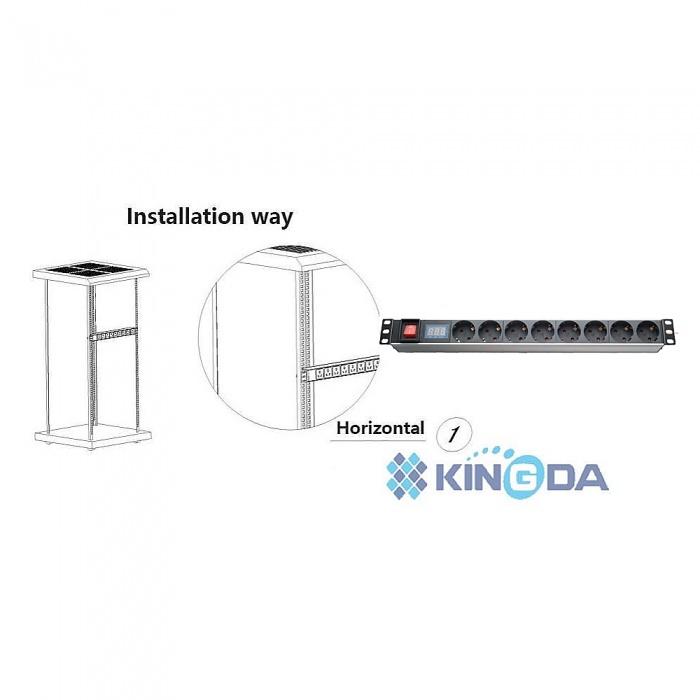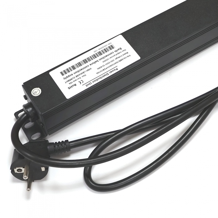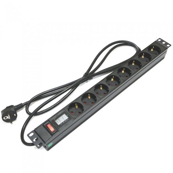 Силовой блок (PDU) предназначен как горизонтальной установки питания оборудования в 19″ формат, так и вертикально, при развороте крепления на 180 градусов. Электрические характеристики: напряжение 220-250В , сила тока 16А, частота 50-60Гц. Блок имеет металлический корпус, в котором размещены гнезда под вилку стандарта CEE 7/7 (Schuko). На лицевой панели размещена кнопка включения/выключения и цифровой дисплей амперметра.