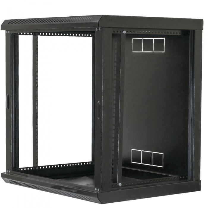 Шкаф выполнен в черном цвете, который придает ему современный и профессиональный вид. Акриловое стекло на передней дверце не только придает эстетическую привлекательность, но и позволяет легко контролировать состояние оборудования без необходимости открывать шкаф.