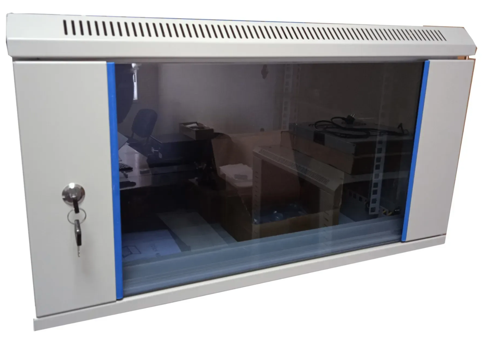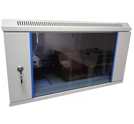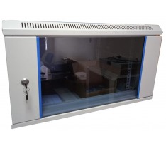Стеклянная дверь не только защищает оборудование от пыли и повреждений, но и позволяет визуально контролировать состояние устройств без необходимости открывать шкаф.