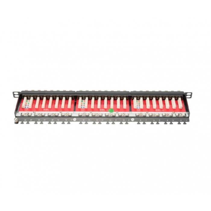 Патч-панель Digitus 19" с 24 портами RJ-45 категории 6A предлагает надежное решение для организации сетевых соединений в стойках. Благодаря экранированной конструкции, этот продукт обеспечивает защиту от электромагнитных и радиочастотных помех, что гарантирует стабильность передачи данных. Компактный размер 0.5U позволяет эффективно использовать пространство в серверной стойке.