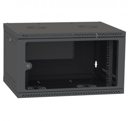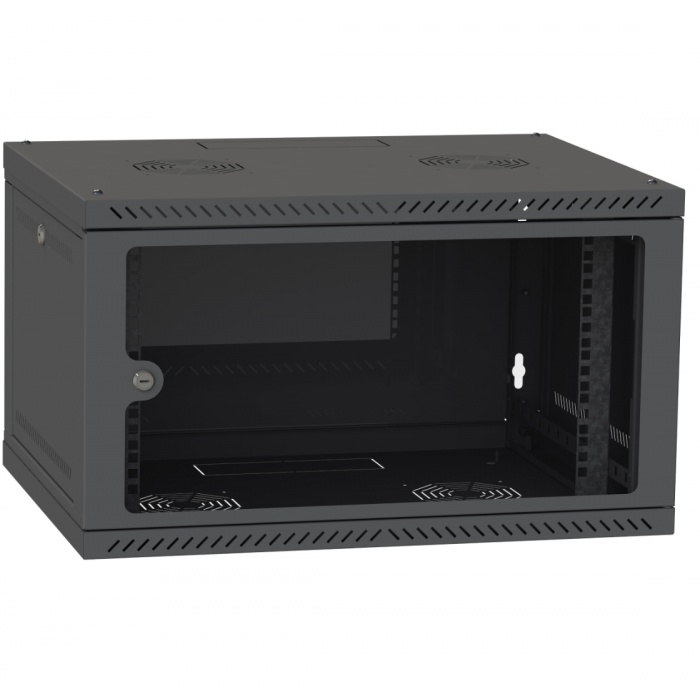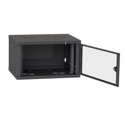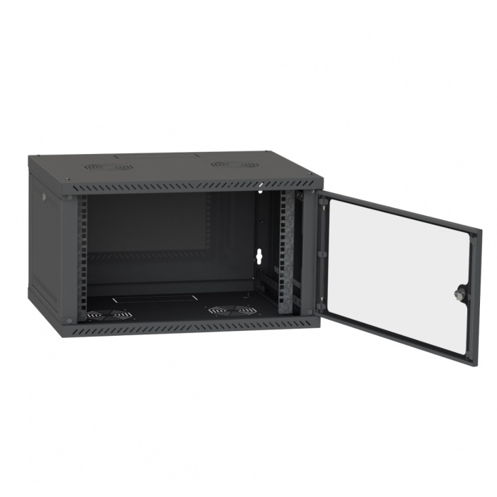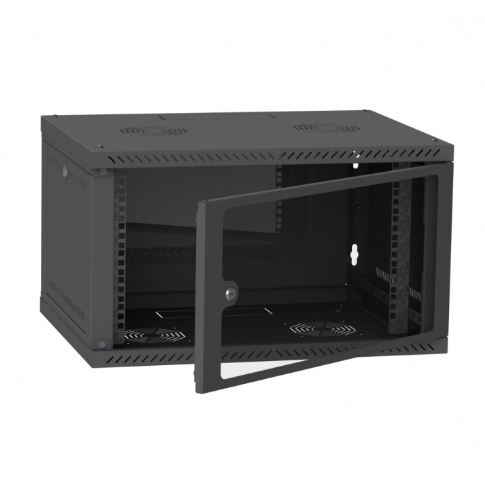 Этот шкаф выполнен из прочных материалов и окрашен в стильный черный цвет (RAL9005), что обеспечивает не только эстетичный внешний вид, но и устойчивость к коррозии и механическим повреждениям. Дверь из закаленного стекла позволяет легко контролировать состояние оборудования без необходимости открывать шкаф.