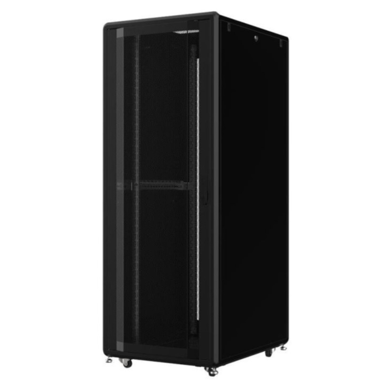 Дизайн шкафа продуман до мелочей: перфорированная дверь способствует эффективной циркуляции воздуха, а стандартный черный цвет (RAL 9005) делает его универсальным для любого интерьера. Шкаф отлично подходит для использования в дата-центрах и серверных комнатах различного масштаба.
