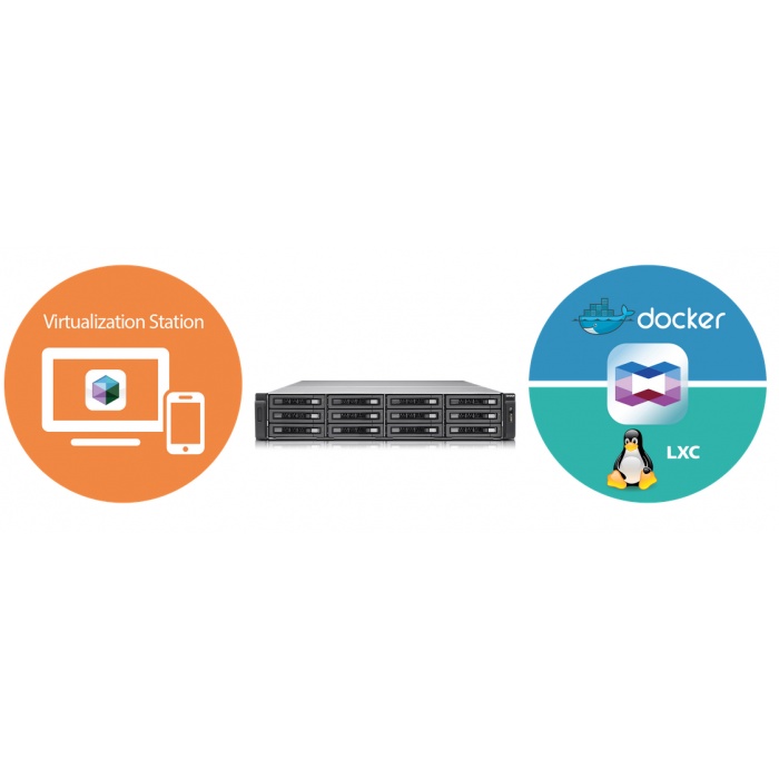 Virtualization Station предназначена для размещения виртуальных машин (ВМ) на сетевом накопителе и взаимодействия с ними через веб-браузеры или VNC. Функционал станции позволяет быстро создавать виртуальные машины, делать бэкапы, снапшоты, восстанавливать, импортировать и экспортировать, а также существует возможность централизованного управления виртуальными машинами. Сетевой накопитель и станция виртуализации способны разделять одни и те же LAN порты между собой. Высокопроизводительный виртуальный коммутатор повышает эффективность обмена, как между виртуальными машинами, так и между виртуальными машинами и накопителем через внутренний интерфейс.
