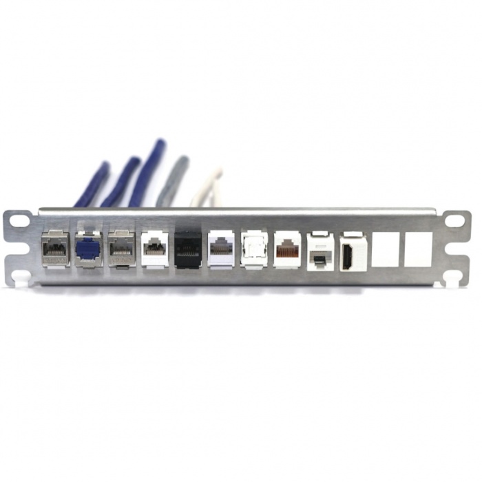 Модульна патч-панель 10″ під 12 модулів KeyStone - одна із складових частин структурованої кабельної системи (СКС), призначена для розключення витої пари з боку точки комутації, наприклад в серверній шафі або комутаційній стійці. Патч-панель виготовлена з нержавіючої сталі і має спрощену конструкцію без кабельного організатора. Для невикористаних портів під модулі передбачені пластикові заглушки з кріпленням формату Keystone.