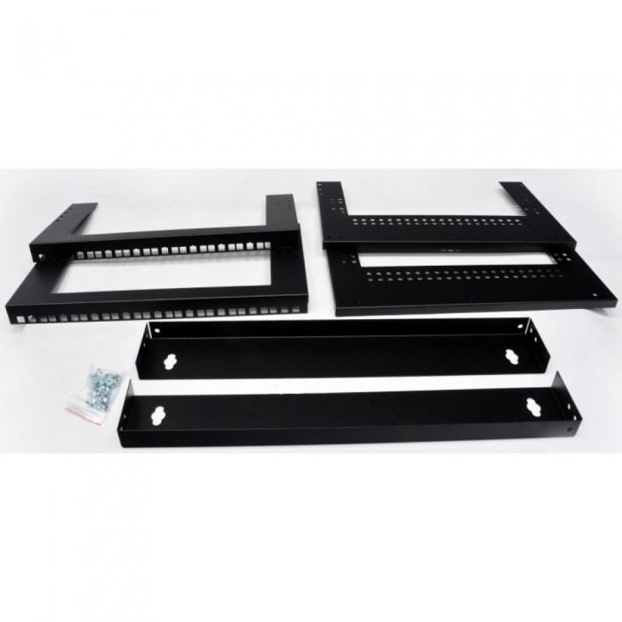 Конструкція настінного комутаційного кронштейна складається із шести елементів, які збираються за 5-10 хвилин у готовий виріб. При складанні доступне регулювання за глибиною від 280 мм до 480 мм. Жорсткість кронштейну надає встановлене в напрямні мережеве обладнання та комплектуючі. Додатково можна встановити кришку.