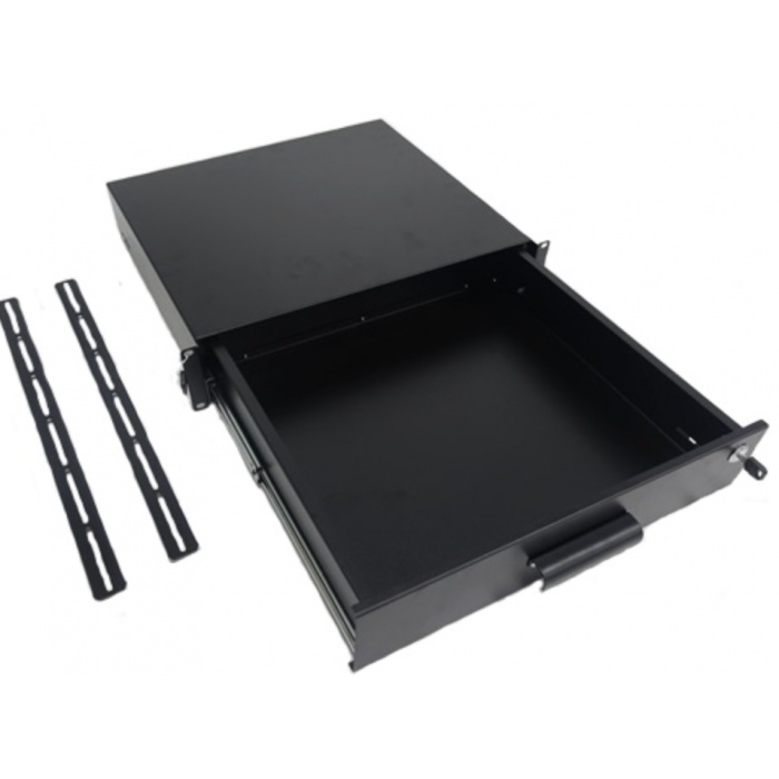 Зручний висувний ящик для зберігання різного приладдя: документації, інструкцій, аксесуарів, витратних матеріалів та інших необхідних речей. Встановлюються у всі моделі 19" серверних стійок глибиною від 400мм. до 750 мм. Замикається на ключ. Для встановлення потрібно 8 комплектів кріплення.