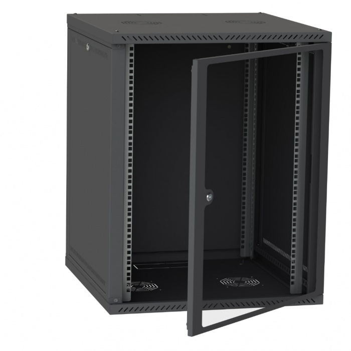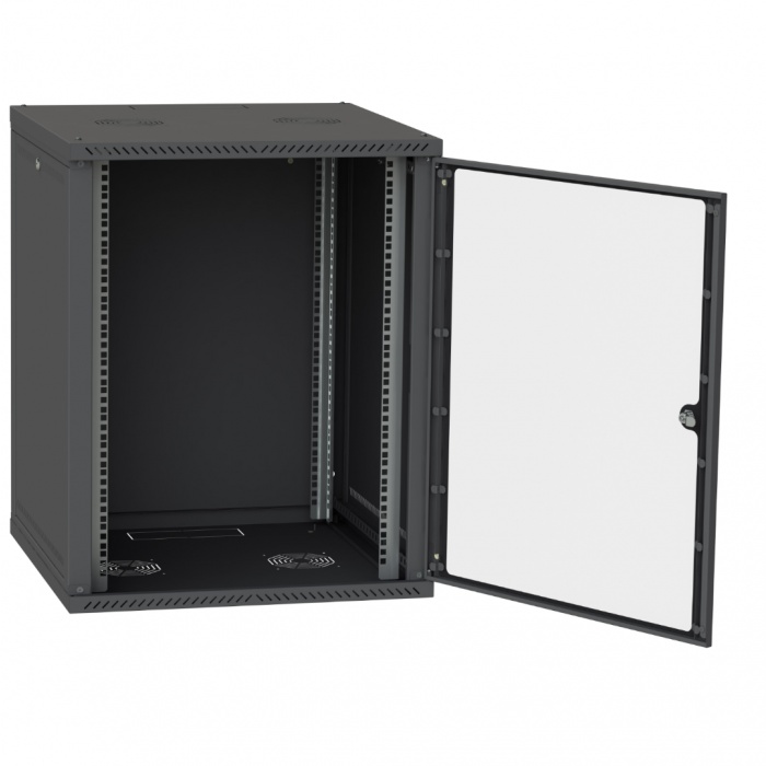 Шафа виконана в сучасному дизайні з покриттям RAL9005, що дозволяє йому легко вписатися в будь-який інтер'єр, створюючи стильний та професійний вигляд. Скляні прозорі двері дають можливість візуального контролю над обладнанням без необхідності відкривати шафу.